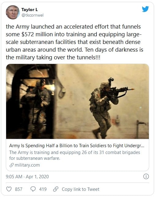 “El ejército lanzó una operación acelerada que incluye unos $ 572 millones en capacitación y el equipamiento de instalaciones subterráneas a gran escala que existen bajo las densas áreas urbanas de todo el mundo. ¡Diez días de oscuridad significa que los militares están tomando control de los túneles!”.