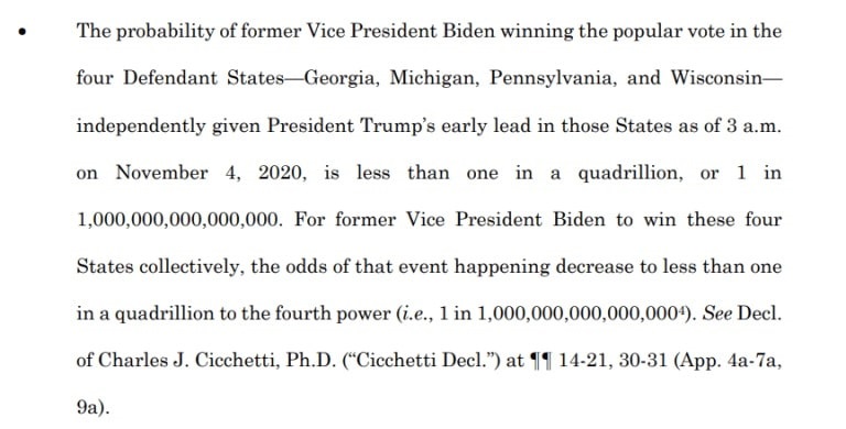 El análisis del Dr. Cicchetti calcula que para que Joe Biden gane los cuatro estados colectivamente, las probabilidades de que ocurra ese evento disminuyen a menos de uno en un cuatrillón a la cuarta potencia (1 en 1 1,000,000,000,000,0004).