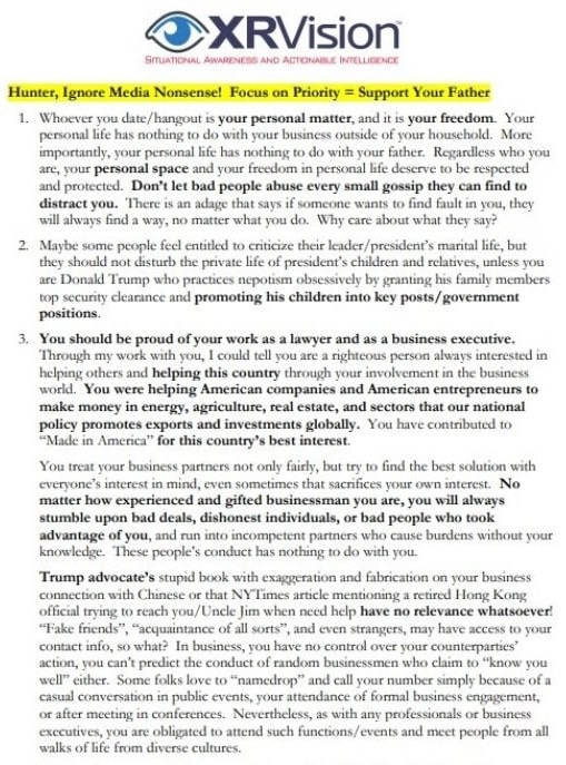 Pero la relación de Hunter con JiaQi fue más que sexual. El CPC (Communist Party of China) a través de JiaQi estaba unificando a los Biden y proporcionando información a los Biden sobre cómo derrotar al presidente Trump en las elecciones. Aquí hay un ejemplo: parte de un correo electrónico de 2 páginas a Hunter que ofrece puntos de conversación:
