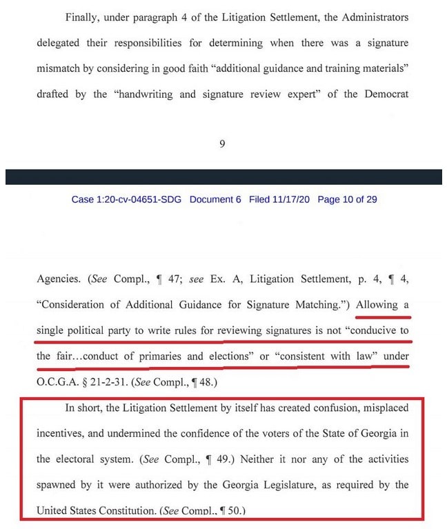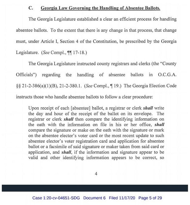 En su moción, Wood afirma que el Secretario de Estado firmó un acuerdo con el partido Demócrata, incluido el abogado de Hillary, Marc Elias, pero el Secretario no tenía derecho a firmar el acuerdo. Este “derecho” recae en el cuerpo legislativo. En la presentación de hoy, Woods comparte más información sobre lo que está sucediendo en Georgia. Wood señala en las páginas 4 y 5 de su presentación que la ley es clara en Georgia: la Legislatura hace las leyes electorales y tiene una ley sobre cómo lidiar con las papeletas de voto ausente: