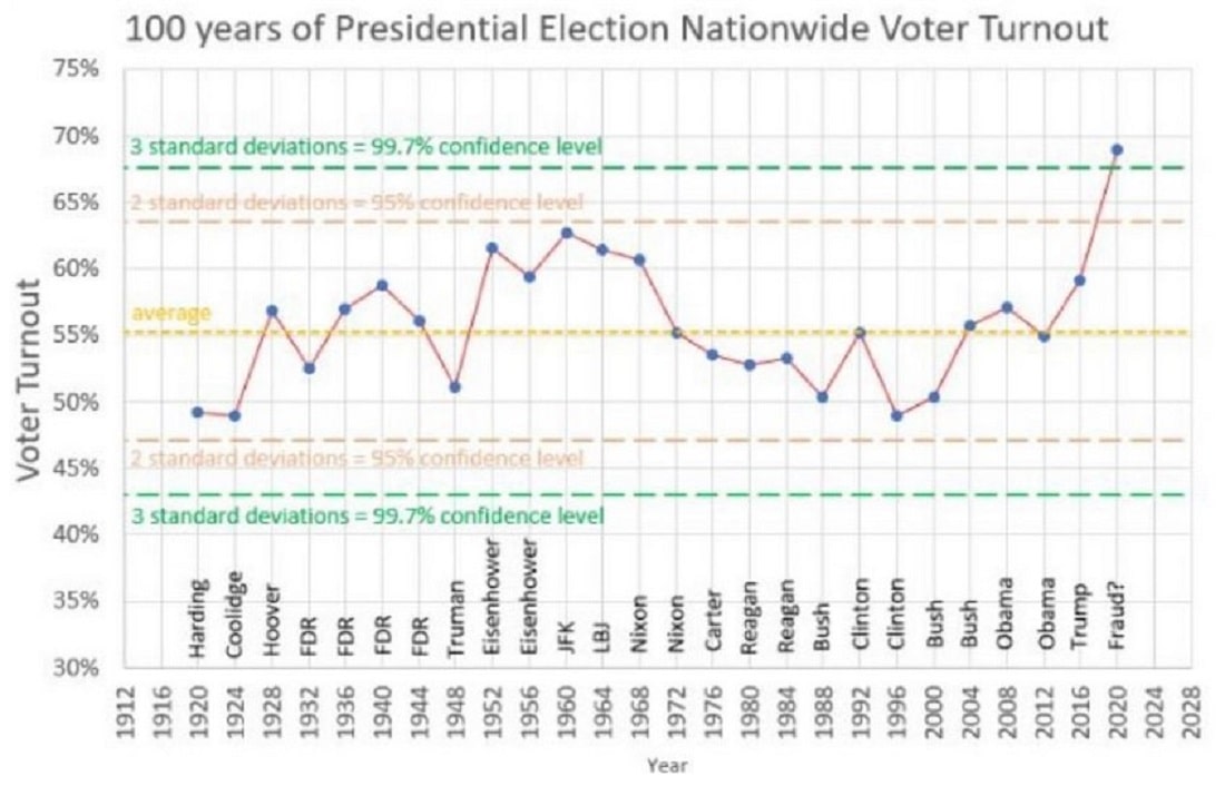 b.) La participación de votantes está sesgada hacia arriba debido al fraude. La izquierda necesitaba enormes cifras de participación para robar la elección del sótano Joe.