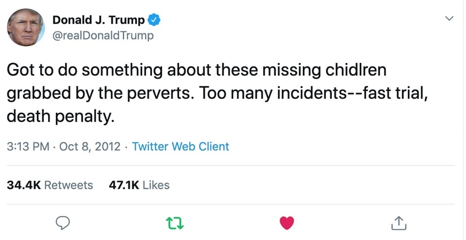Como firme defensor de las víctimas de delitos sexuales, he estado siguiendo de cerca los arrestos de pedófilos desde que Trump asumió el cargo. Ha habido la asombrosa cantidad de más de 1,500 arrestos en solo un mes; compara eso con menos de 400 arrestos relacionados con el tráfico sexual en 2014 según el FBI. Ha quedado claro para mí que Trump haría el tráfico de personas una prioridad máxima. El 8 de octubre de 2012, Trump tuiteó: