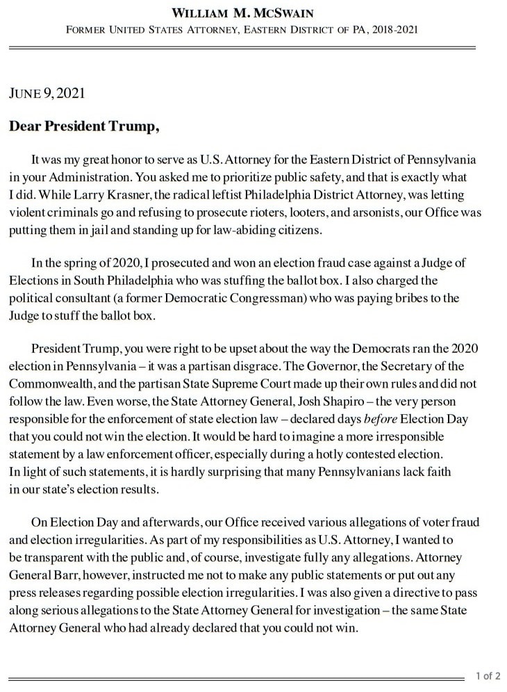 El presidente Trump dio a conocer esta noche la carta que recibió del exfiscal de Estados Unidos para el Distrito Este de Pensilvania, William McSwain. En la carta, McSwain compartió lo siguiente (Traducción):