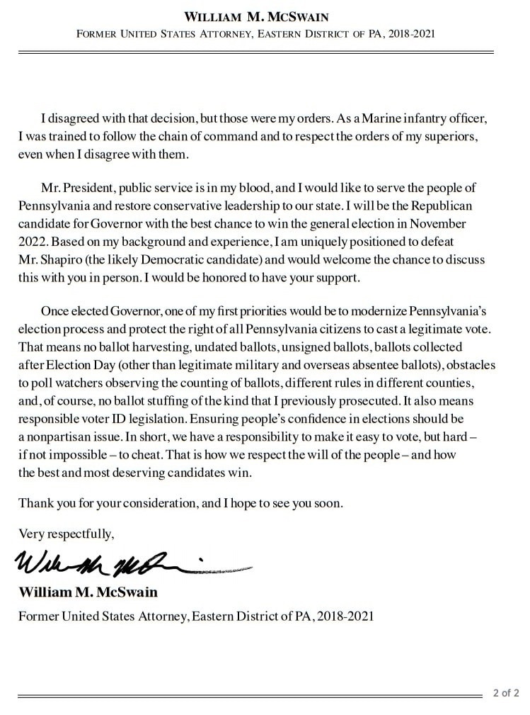 Basado en mis antecedentes y experiencia, estoy en una posición única para derrotar al Sr. Shapiro (el probable candidato demócrata) y agradecería la oportunidad de discutir esto con usted en persona. Sería un honor contar con su apoyo. Una vez elegido gobernador, una de mis primeras prioridades sería modernizar el proceso electoral de Pensilvania y proteger el derecho de todos los ciudadanos de Pensilvania a emitir un voto legítimo. Eso significa que no hay recolección de boletas, boletas sin fecha, boletas sin firmar, boletas recolectadas después del día de las elecciones (solo las boletas electorales ausentes legítimas militares y en el extranjero), obstáculos para que los observadores electorales observen el conteo de boletas, diferentes reglas en diferentes condados y, por supuesto, ningún relleno de boletas como a las personas que procesé legalmente por hacerlo. También significa legislación responsable de identificación de votantes. Garantizar la confianza de la gente en las elecciones debe ser una cuestión no partidista. En resumen, tenemos la responsabilidad de facilitar la votación, pero difícil, si no imposible, hacer trampa. Así es como respetamos la voluntad del pueblo y cómo ganan los mejores y los candidatos que más se lo merecen.