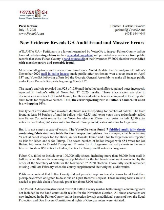 ATLANTA GA – Los peticionarios en una demanda organizada por VoterGA para inspeccionar las boletas del condado de Fulton agregaron reclamos sorprendentes en su queja enmendada y proporcionaron nueva evidencia de los registros públicos que muestran que la auditoría del conteo manual del condado de Fulton de las elecciones del 3 de noviembre de 2020 estuvo plagada de errores masivos y fraude demostrable.